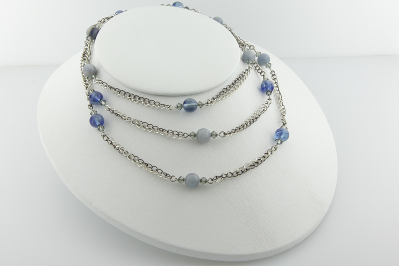 5. Сглобете гердана на същия принцип, като редувате телчетата с кварц син мъх и кристали Сваровски и телчетата със син авентурин и кристали Сваровски.