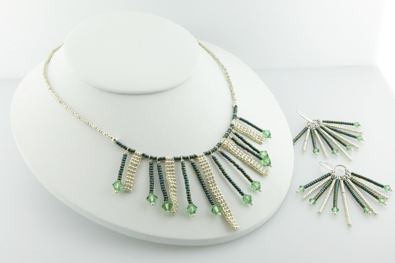 Станчето за мъниста е изключително забавен и полезен уред - с него можете да си напрвите както цели божута и аксесоари, така и ефектни елементи от мъниста, с които да допълните дизайните си, като това колие от ситни японски мъниста Тохо и кристали Сваровски...