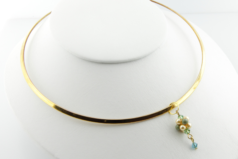 14. Следвайте инструкциите от виртуалното ателие на Marabu.bg за да отворите позлатената халкичка без да я деформирате. Нанижете халкичката на свободното уше на телчето с плетено мънисто и прикачете към основата за огърлица.