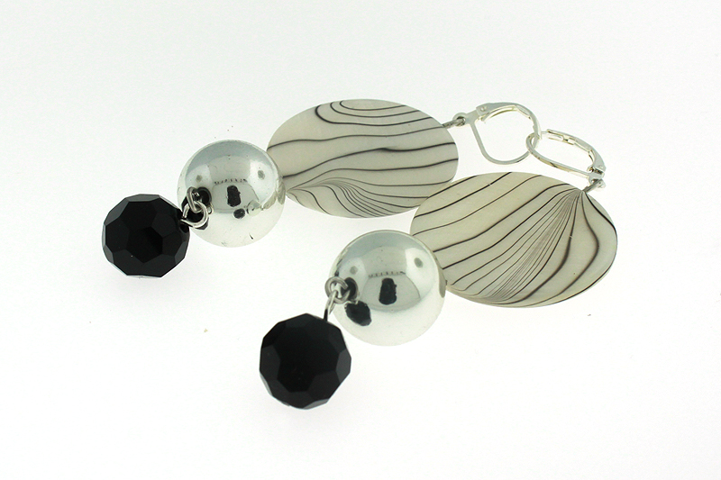 1. Нанижете 1 мънисто от седеф с черно-бял принт на телче с уше. С помощта на плоските клещи, облите клещи и инструкциите във виртуалното ателие на Marabu.bg оформете второ уше над мънистото.