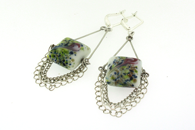 4. Отворете 1 от ушетата на телчето с нанизано стъклено мънисто с паунска шарка и нанижете трите верижки, като започнете от най-фината. Накрая нанижете и 1 от ушетата на подготвените телчета с по 2 ушета.