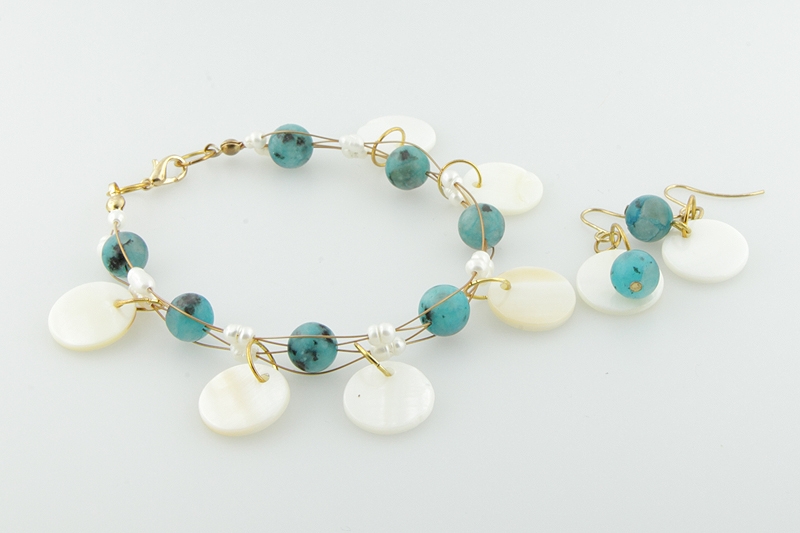 7. Нанижете мънистата от седеф на останалите халкички и закачете за телта между мънистата от лазурносин яспис. Следвайте инструкциите от виртуалното ателие на Marabu.bg за да отворите и затворите халкичките без да ги повредите.