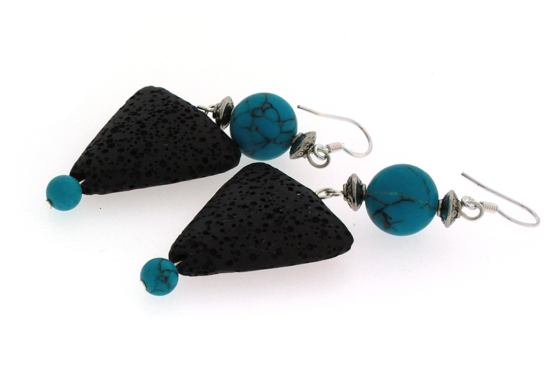 1. Нанижете на телче с главичка 1 мънисто от тюркоаз 6 мм, а след него и 1 мънисто от вулканична лава (върхът на триъгълното вулканично мънисто трябва да сочи към мънистото от тюркоаз). Прегънете телчето под прав ъгъл с клещите с плоски челюсти точно над мънистото от вулканична лава, след което следвайте инструкциите от нашето виртуално ателие за да оформите уше.