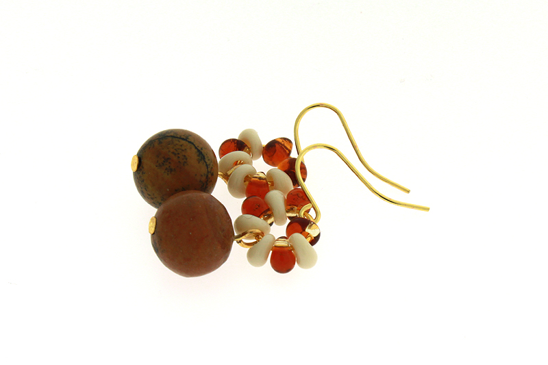 3. Нанижете на халкичката 1 мънисто Тохо Магатама опушен топаз, 1 бежово мънисто Тохо Магатама, 1 мънисто Тохо Магатама опушен топаз, 1 бежово мънисто Тохо Магатама, ушето на телчето с мънисто от пейзажен яспис, 1 бежово мънисто Тохо Магатама, 1 мънисто Тохо Магатама опушен топаз, 1 бежово мънисто Тохо Магатама, 1 мънисто Тохо Магатама опушен топаз и ушето на кукичката за обица. Затворете халкичката, като отново използвате двата чифта бижутерски клещи от стъпка 2.
