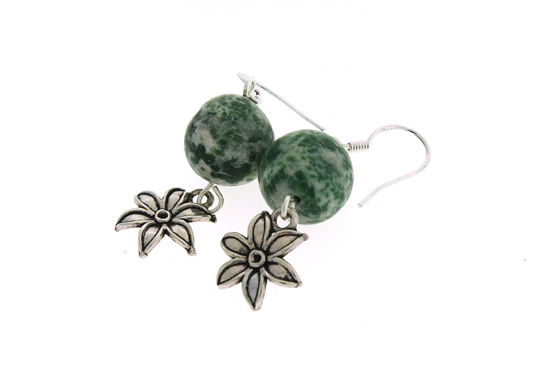 Лесен модел обици, подходящ за напулно начинаещи. Металните цветя Бали се съчетават чудесно както с петнистия нефрит на модела, така и с вашия зодиакален полускъпоценен камък, или любими кръгли мъниста от друг материал.