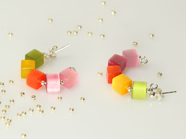 Направете си цветни обици, комбинирайте ги и с гривната Лятна дъга и ще имате чуден комплект. Съчетанието на мемори тел с мъниста кубчета е невероятно красиво. Пробвайте, изключително лесно е!