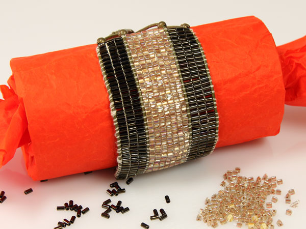 Със съчетанието между мъниста Тохо и кожен шнур гривната се оказа невероятно ефектна. Ако желаете можете да намалите ширината й. Капачета антик придават закачлив и завършен вид.