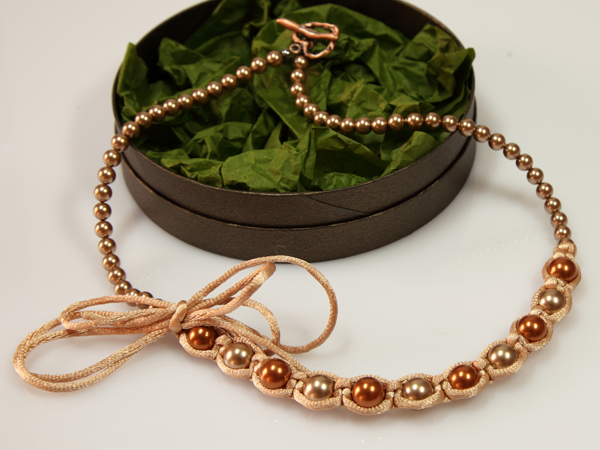 Микромакраме с перли - нетрадиционно, но доста сполучливо решение. Копринения цвят на сатенения шнур отлично пасна с красивите и топли перли. А панделката е чудесен закачлив елемент, подходящ за всяко момиче.