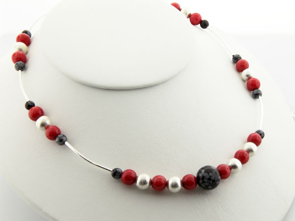 3. Продължете низане с мънисто обсидиан, нефрит, метално мънисто, нефрит, метално мънисто, нефрит, обсидиан 12 мм. Оттук наниза продължава в симетричен ред на нанизаните досега мъниста.